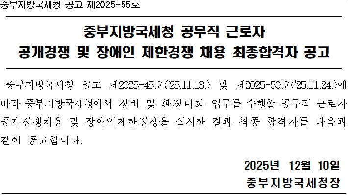 중부지방국세청 공고 제2025-55호 중부지방국세청 공무직 근로자 공개경쟁 및 장애인 제한경쟁 채용 최종합격자 공고 중부지방국세청 공고 제2025-45호(’25.11.13.) 및 제2025-50호(’25.11.24.)에 따라 중부지방국세청에서 경비 및 환경미화 업무를 수행할 공무직 근로자 공개경쟁채용 및 장애인제한경쟁을 실시한 결과 최종 합격자를 다음과 같이 공고합니다. 2025년 12월 10일 중부지방국세청장