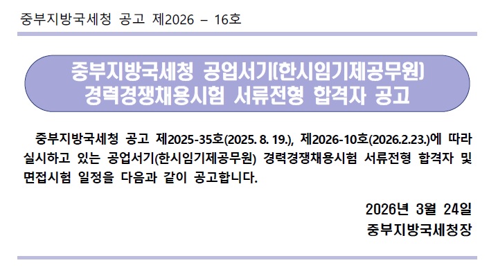 중부지방국세청 공고 제2026 – 16호 중부지방국세청 공업서기(한시임기제공무원)경력경쟁채용시험 서류전형 합격자 공고 중부지방국세청 공고 제2025-35호(2025. 8. 19.), 제2026-10호(2026.2.23.)에 따라 실시하고 있는 공업서기(한시임기제공무원) 경력경쟁채용시험 서류전형 합격자 및 면접시험 일정을 다음과 같이 공고합니다. 2026년 3월 24일 중부지방국세청장