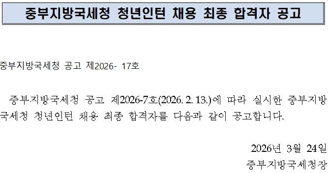중부지방국세청 청년인턴 채용 최종 합격자 공고 중부지방국세청 공고 제2026- 17호 중부지방국세청 공고 제2026-7호(2026.2.13.)에 따라 실시한 중부지방국세청 청년인턴 채용 최종 합격자를 다음과 같이 공고합니다. 2026년 3월 24일 중부지방국세청장