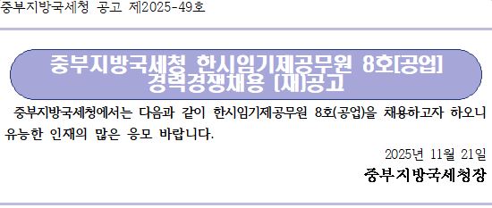 중부지방국세청 공고 제2025-49호 중부지방국세청 한시임기제공무원 8호[공업] 경력경쟁채용 (재)공고 중부지방국세청에서는 다음과 같이 한시임기제공무원 8호(공업)을 채용하고자 하오니 유능한 인재의 많은 응모 바랍니다. 2025년 11월 21일 중부지방국세청장