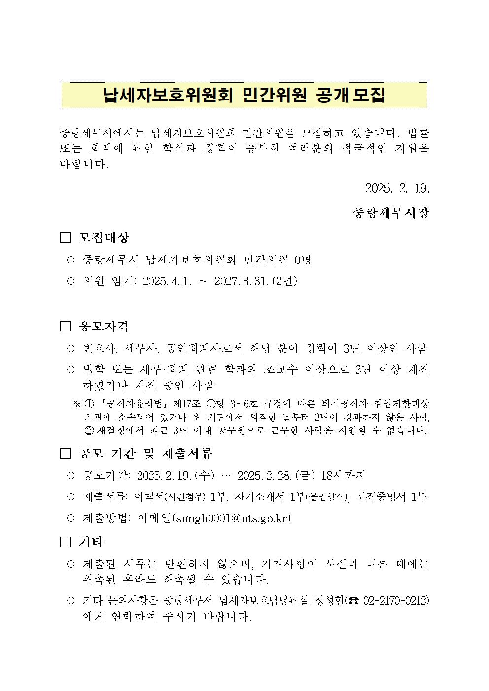 25년 중랑세무서 납세자보호위원회 민간위원 공개모집 공고문.hwpx