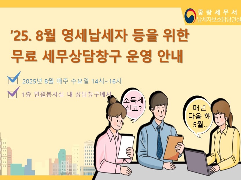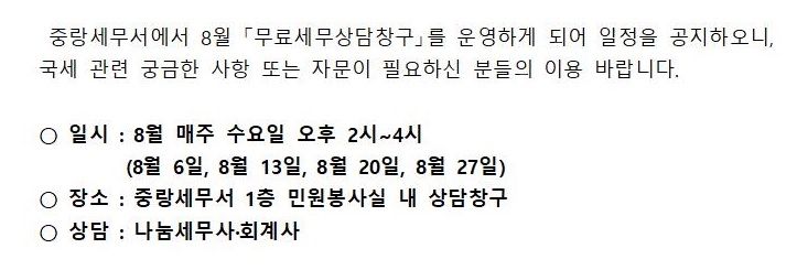 25년 8월 무료세무상담창구 운영 일정 안내