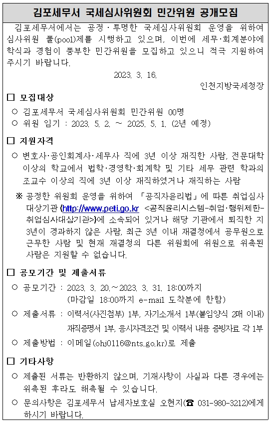 김포세무서 국세심사위원회 민간위원 공개모집 안내