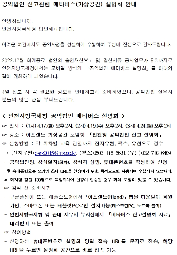 공익법인 신고 관련 메타버스(가상공간) 설명회 안내