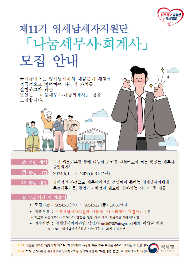- 접수방법: 영세납세자지원단 담당자(uni5678@nts.go.kr)에게 이메일 제출