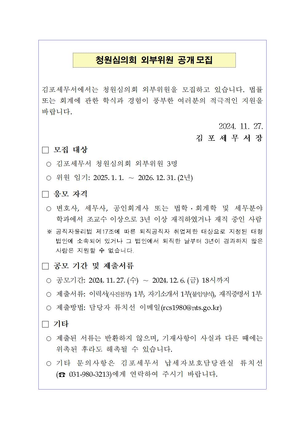 1. 김포세무서 청원심의회 외부위원 공개모집 공고문.hwpx