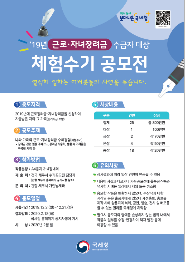 19년 장려금 수혜자 체험수기 공모전 공고합니다. 수기 접수 담당자는 백한나 조사관 ☎031-980-3365, naa0323@nts.go.kr 로 문의 바랍니다.