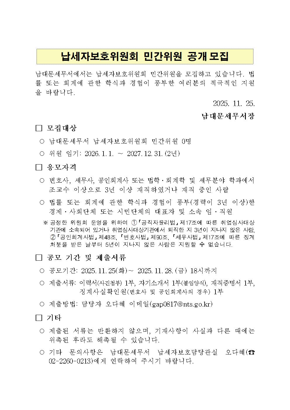 26년 납세자보호위원회 민간위원 정기 위촉계획(남대문세무서).hwpx