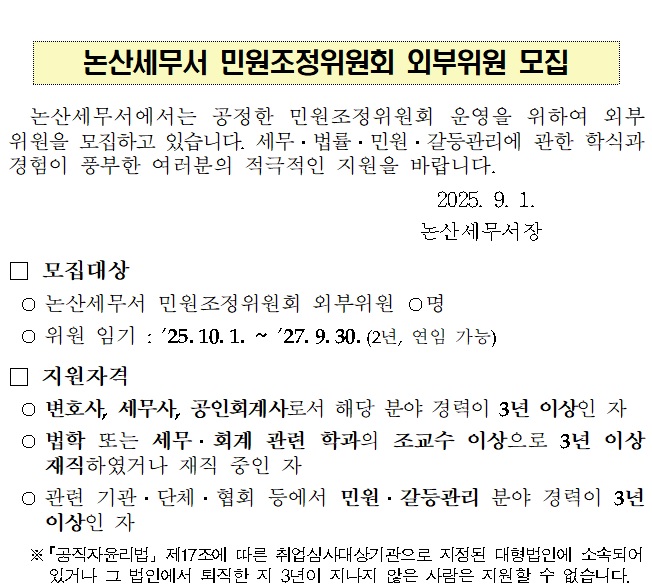 논산세무서에서는 공정한 민원조정위원회 운영을 위하여 외부위원을 모집하고 있습니다.