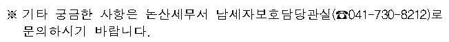 기타 궁금한 사항은 논산세무서 납세자보호담당관실(☎041-730-8212)로 문의하시기 바랍니다.