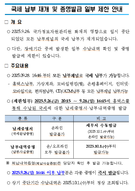 국세 납부 재개 및 일부 증명발급 제한 안내