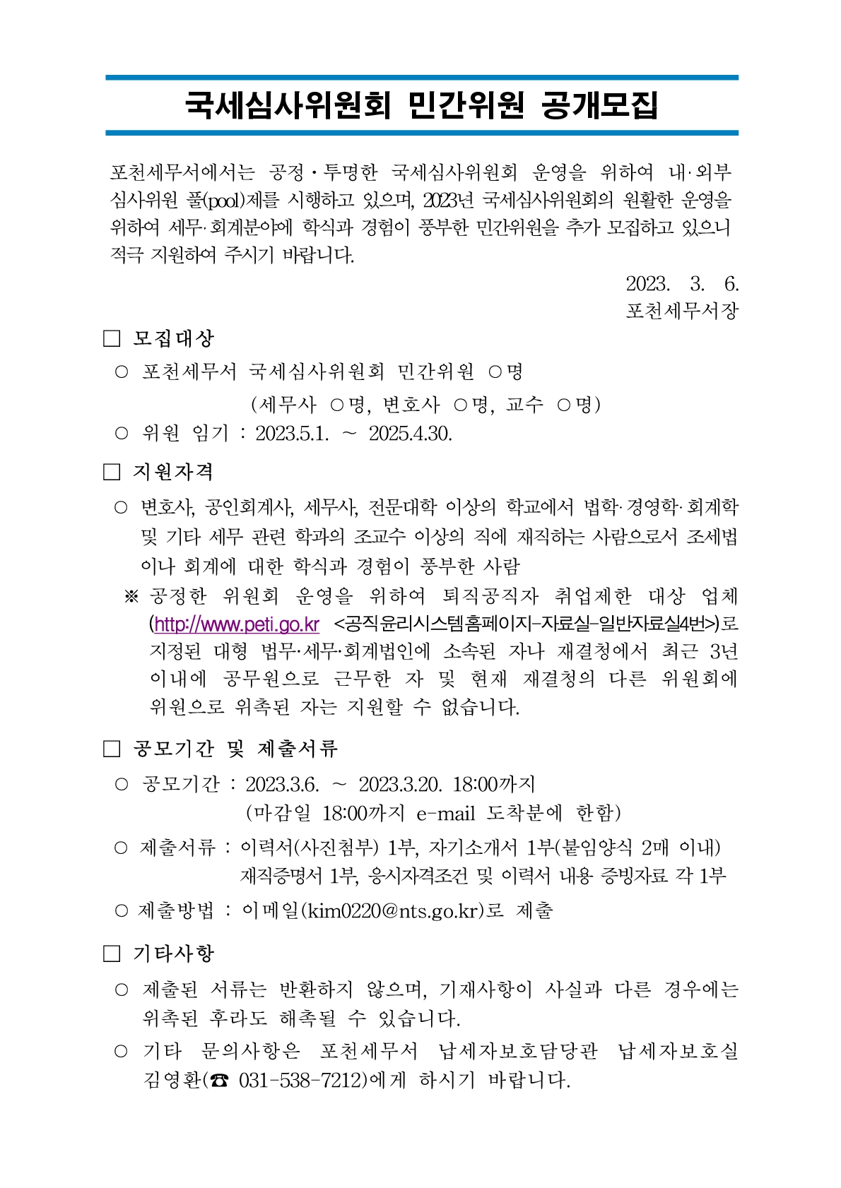 국세심사위원회 민간위원 공개모집 (모집기간: 23.3.6.~23.3.20.)