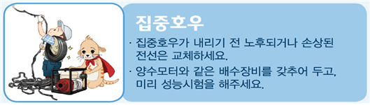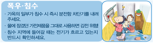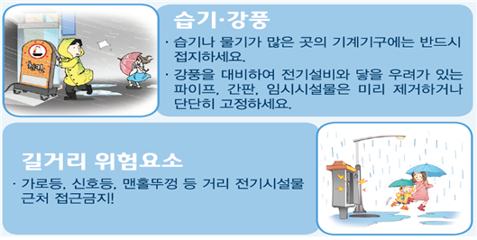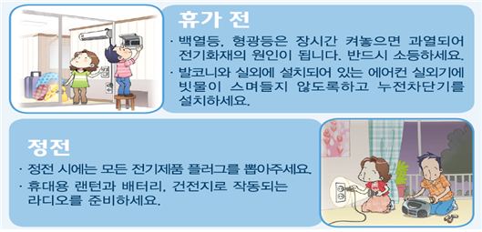 호우시 안전 | 우기 전, 전기시설 한 번 더 확인합시다! ⇒ 건물이나 대용량 전기기구는 회로별로 누전차단기 설치, 한 달에 1~2회 누전차단기 작동유무 확인 |