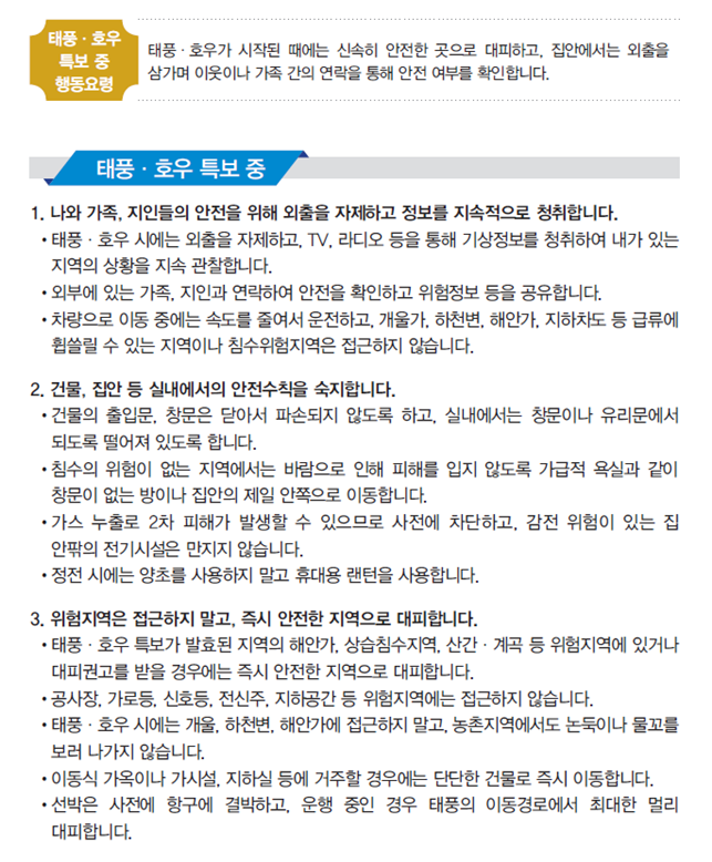 침수된 도로, 다리, 보도 등은 건너지 않기 ⇒ 침수된 도로, 다리, 보도 등은 파손 가능성이 있어 위험하므로 건너지 않기 |
