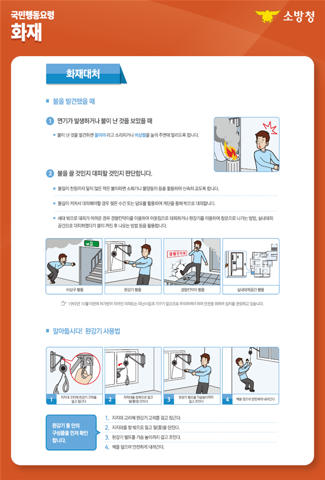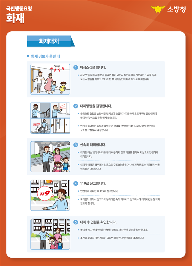 ○ 화재 시, 유독가스가 퍼지는 5분내 대피! ⇒ 화재가 발생한 곳의 반대방향 비상구・계단 이용, 젖은 수건 등으로 입․코를 막고 최대한 자세를 낮춰 이동 |