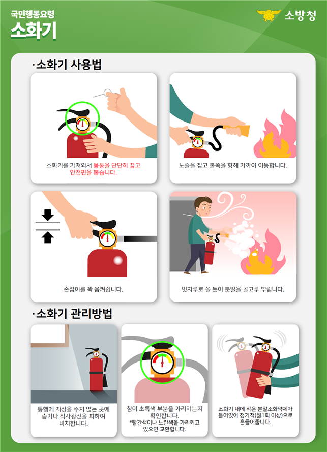 ○ 전열기 사용 후 플러그 뽑기, 생명을 지킨다! ⇒ 누전・가스 차단기의 정상작동 확인・점검, 소화기 비치 및 사용방법 숙지 |