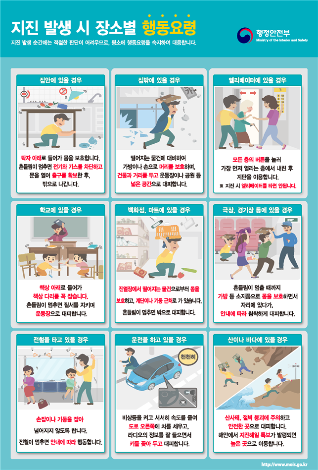 지진 발생 시 상황별・장소별 행동요령 [출처: 행정안전부]