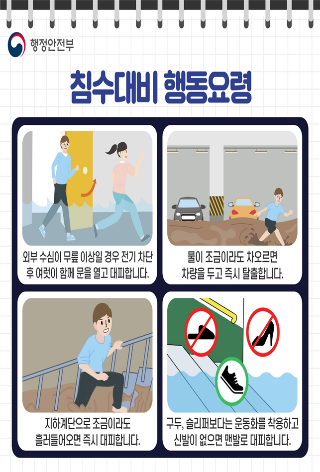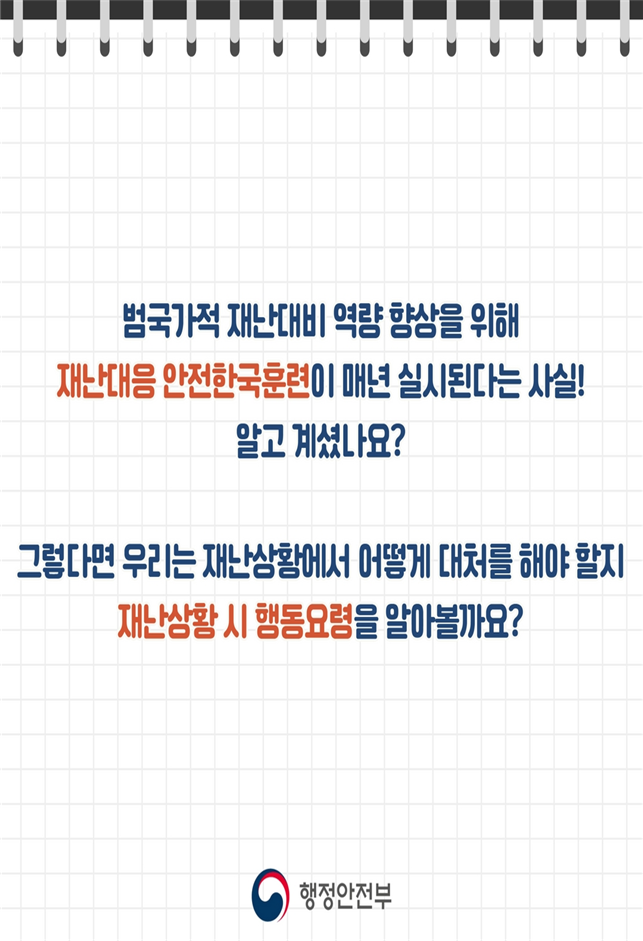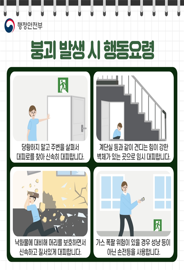 ○ 화재 시, 유독가스가 퍼지는 5분내 대피! ⇒ 화재가 발생한 곳의 반대방향 비상구・계단 이용, 젖은 수건 등으로 입․코를 막고 최대한 자세를 낮춰 이동 |