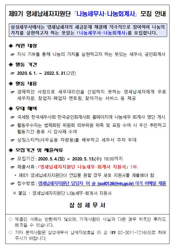 제9기 영세납세자지원단 『나눔세무사•나눔회계사』모집 안내