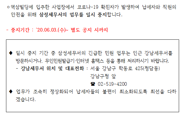 <긴급> 삼성세무서 업무 일시중지 안내