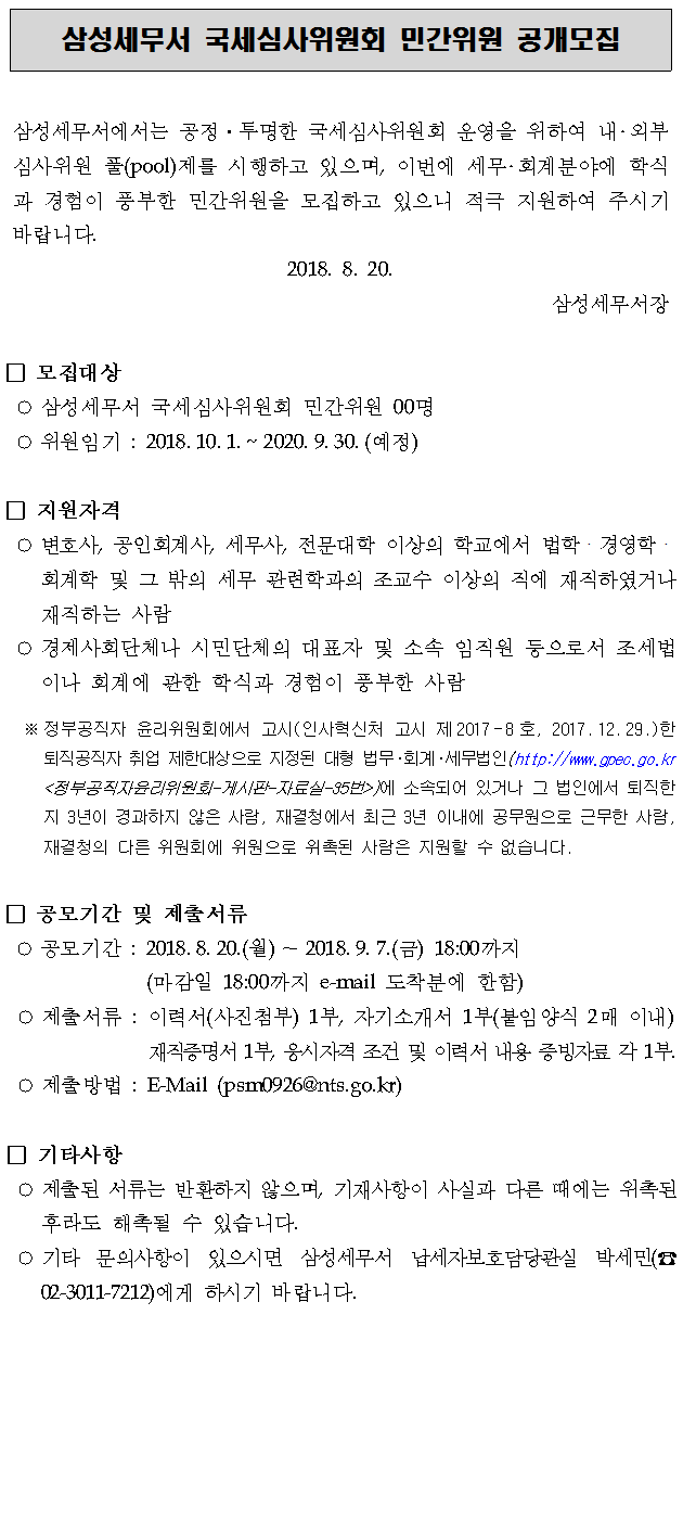 삼성세무서 국세심사위원회 민간위원 공개모집