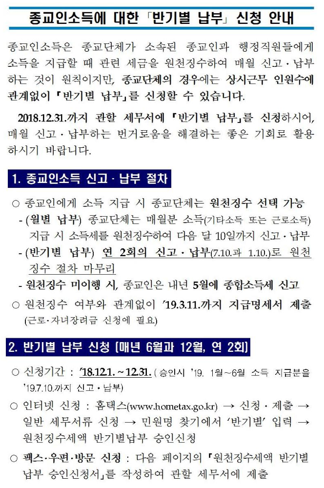 종교인소득에 대한 「반기별 납부」 신청 안내