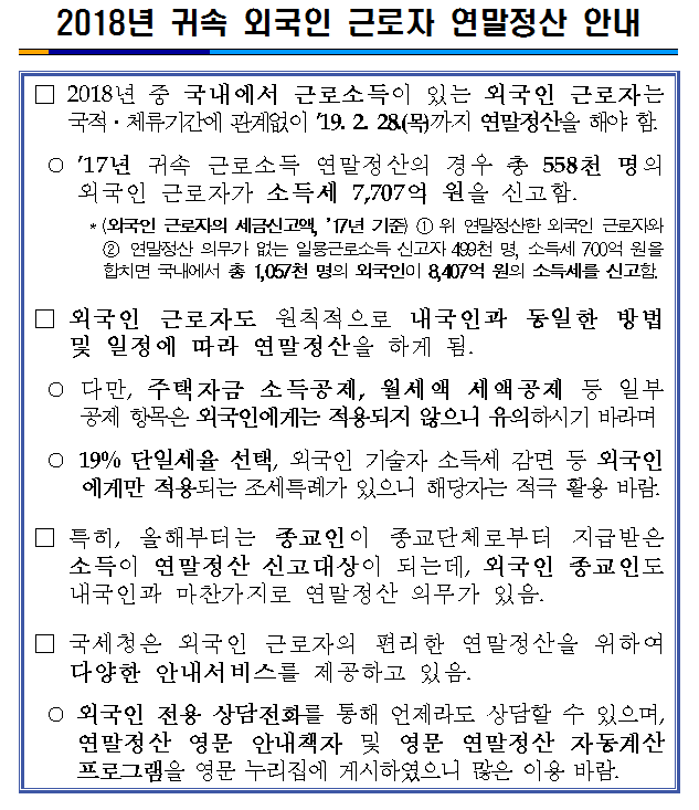 2018년 귀속 외국인 근로자 연말정산 안내