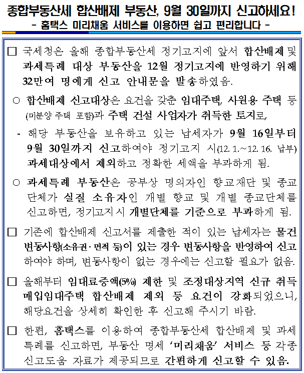 종합부동산세 합산배제 부동산, 9월 30일까지 신고하세요!