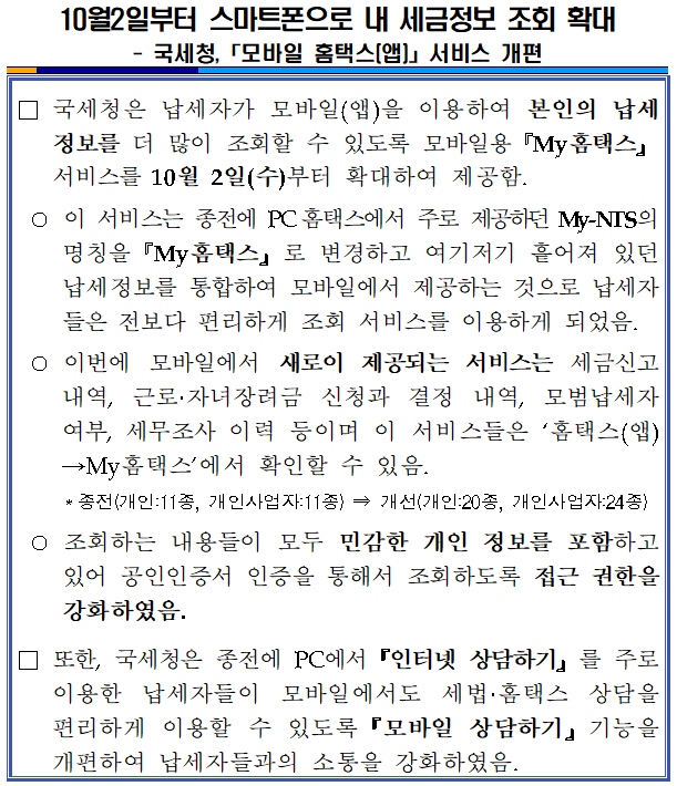 10월2일부터 스마트폰으로 내 세금정보 조회 확대