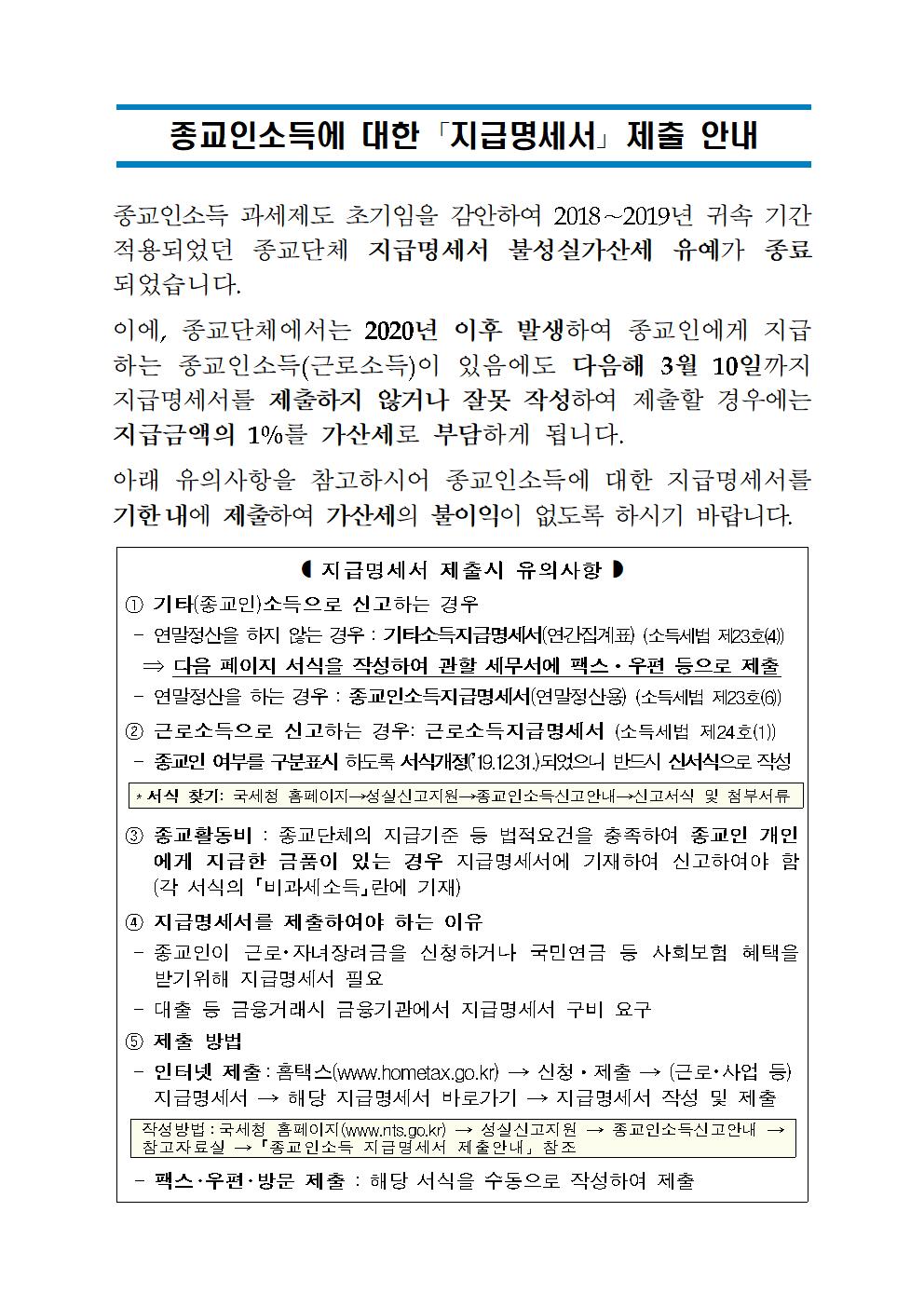 종교인소득에 대한 「지급명세서」 제출 안내
