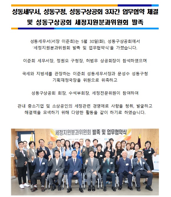 성동세무서, 성동구청, 성동구상공회 3자간 업무협약 체결 및 성동구상공회 세정지원분과위원회 발족