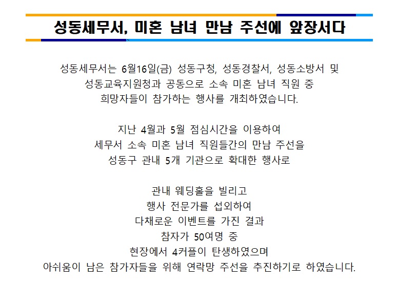 성동세무서, 미혼 남녀 만남 주선에 앞장서다