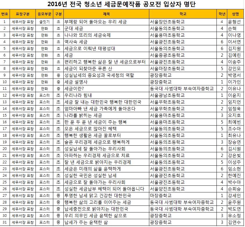 제50회 [납세자의 날]을 기념하여 세금에 대한 올바른 이해와 성실납세의 소중함을 일깨우기 위해 개최한 "2016년 전국청소년 세금문예작품 공모전"에서 성동세무서장상에 입상한 입상자 명부를 아래와 같이 안내합니다.