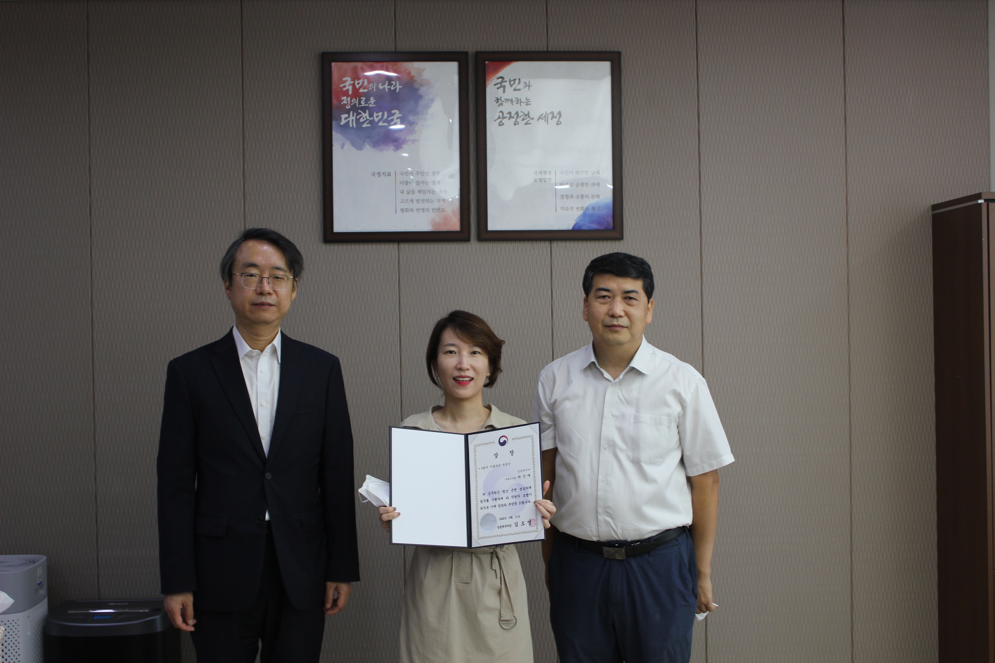 성동세무서(서장 김오영)는 9.11.(금)에 이달(8월)의 「아름다운 성동인」을 선정하여 표창 수여식을 치렀습니다. 김오영 서장은 선정된 직원들에게 표창장과 부상(화분)을 수여하고 직원들의 노고를 치하하였습니다.