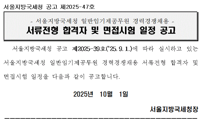 서울지방국세청 공고 제2025-47호 입니다. 서울지방국세청 공고 제2025-39호에 따라 실시하고 있는 서울지방국세청 일반임기제공무원 경력경쟁채용 서류전형 합격자 및 면접시험 일정을 다음과 같이 공고합니다. 2025년 10월 1일 서울지방국세청장