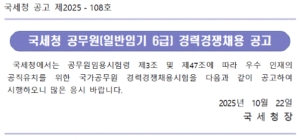 국세청 공고 제2025-108호 입니다. 국세청에서는 공무원임용시험령 제3조 및 제47조에 따라 우수 인재의 공직유치를 위한 국가공무원 경력경쟁채용시험을 다음과 같이 공고하여 시행하오니 많은 응시 바랍니다. 2025년 10월 22일 국세청장