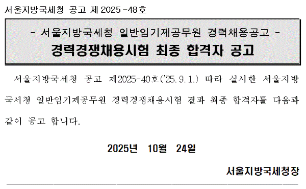 서울지방국세청 공고 제2025-48호 입니다. 서울지방국세청 공고 제2025-40호에 따라 실시한 서울지방국세청 일반임기제공무원 경력경쟁채용시험 결과 최종 합격자를 다음과 같이 공고합니다. 2025년 10월 24일 서울지방국세청장