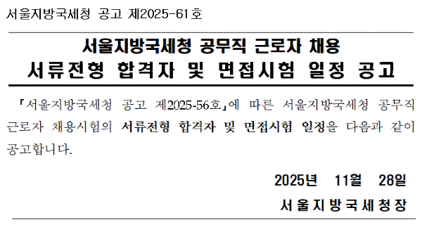 서울지방국세청 공고 제2025-61호 입니다. 서울지방국세청 공고 제2025-56호에 따른 서울지방국세청 공무직 근로자 채용시험의 서류전형 합격자 및 면접시험 일정을 다음과 같이 공고합니다. 2025년 11월 28일 서울지방국세청장