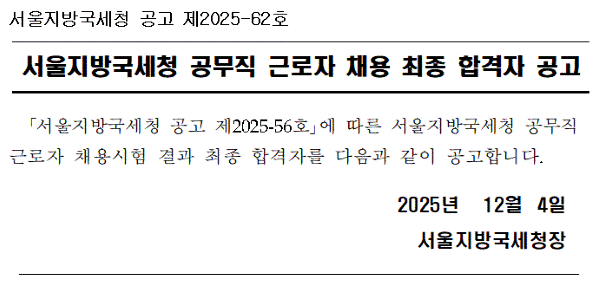 서울지방국세청 공고 제2025-62호 입니다. 서울지방국세청 공고 제2025-56호에 따른 서울지방국세청 공무직 근로자 채용시험 결과 최종 합격자를 다음과 같이 공고합니다. 2025년 12월 4일 서울지방국세청장