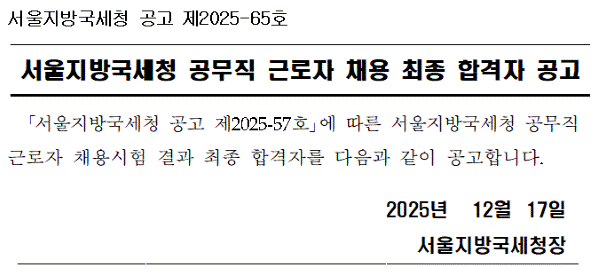 서울지방국세청 공고 제2025-65호 입니다. 서울지방국세청 공고 제2025-57호에 따른 서울지방국세청 공무직 근로자 채용시험 결과 최종 합격자를 다음과 같이 공고합니다. 2025년 12월 17일 서울지방국세청장