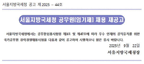 서울지방국세청 공고 제2025-44호 입니다. 서울지방국세청에서는 공무원임용시험령 제3조 및 제47조에 따라 우수 인재의 공직유치를 위한 국가공무원 경력경쟁채용시험을 다음과 같이 공고하여 시행하오니 많은 응시 바랍니다. 2025년 9월 22일 서울지방국세청장