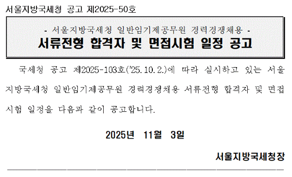 서울지방국세청 공고 제2025-50호 입니다. 국세청 공고 제2025-103호에 따라 실시하고 있는 서울지방국세청 일반임기제공무원 경력경쟁채용 서류전형 합격자 및 면접시험 일정을 다음과 같이 공고합니다. 2025년 11월 3일 서울지방국세청장
