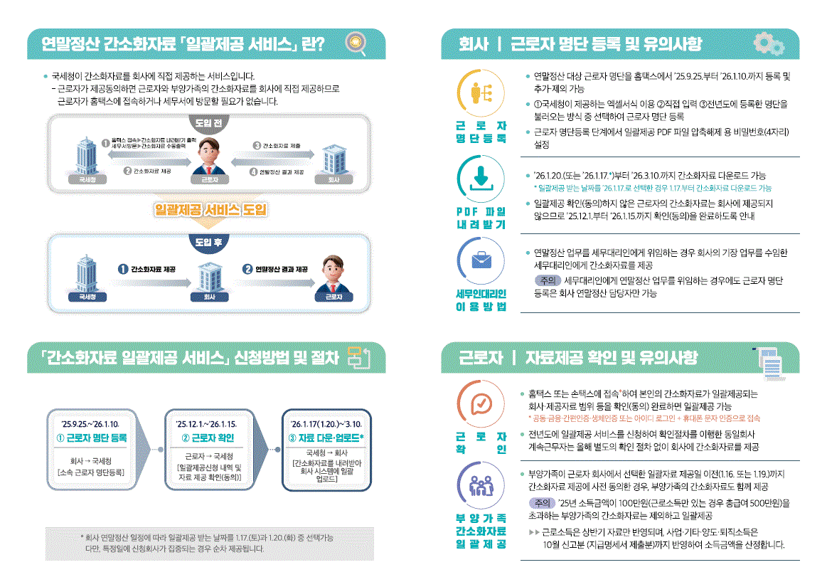 - 국세청은 근로자가 직접 홈택스에서 내려받아 회사에 제출하던 연말정산 간소화자료를 국세청이 회사에 직접 제공하는 「일괄제공 서비스」를 시행하고 있습니다.