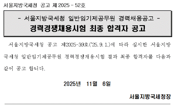 서울지방국세청 공고 제2025-52호 입니다. 서울지방국세청 공고 제2025-39호에 따라 실시한 서울지방국세청 일반임기제공무원 경력경쟁채용시험 결과 최종 합격자를 다음과 같이 공고합니다. 2025년 11월 6일 서울지방국세청장