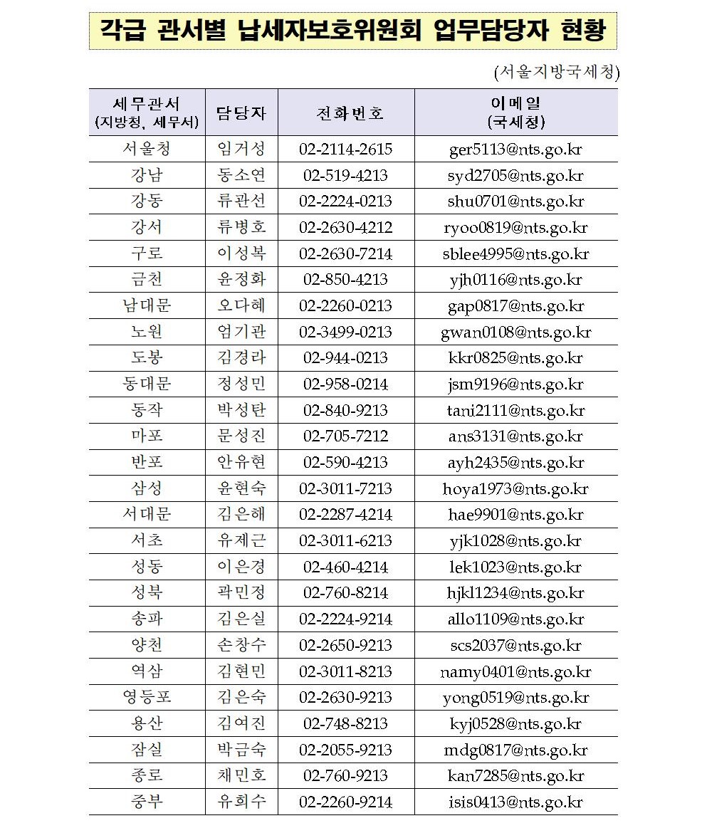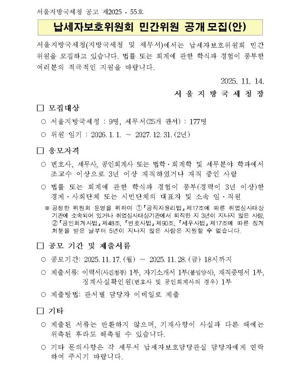 납세자보호위원회 민간위원 공개모집안입니다. 서울지방국세청(지방국세청 및 세무서)에서는 납세자보호위원회 민간위원을 모집하고 있습니다. 법률 또는 회계에 관한 학식과 경험이 풍부한 여러분의 적극적인 지원을 바랍니다. 2025년 11월 14일 서울지방국세청장 모집대상은 서울지방국세청 9명, 세무서 177명이고 위원 임기는 2026년 1월 1일부터 2027년 12월 31일까지입니다. 응모자격은 변호사, 세무사, 공인회계사 또는 법학,회계학 및 세무분야 학과에서 조교수 이상으로 3년 이상 재직하였거나 재직 중인 사람, 법률 또는 회계에 관한 학식과 경험이 풍부(경력이 3년 이상)한 경제,사회단체 또는 시민단체의 대표자 및 소속 임,직원입니다. 공직자윤리법 제17조에 따른 취업심사대상기관에 소속되어 있거나 취업심사대상기관에서 퇴직한 지 3년이 지나지 않은 사람, 공인회계사법 제48조, 변호사법 제90조, 세무사법 제17조에 따른 징계처분을 받는 날부터 5년이 지나지 않은 사람은 지원할 수 없습니다. 공모기간은 2025년 11월 17일부터 2025년 11월 28일 18시까지이며 제출서류는 이력서(사진첨부)1부, 자기소개서 1부(붙임양식), 재직증명서 1부, 징계사실확인원(변호사 및 공인회계사의 경우) 1부입니다. 제출방법은 관서별 담당자 이메일로 제출입니다. 제출된 서류는 반환하지 않으며, 기재사항이 사실과 다른 때에는 위촉된 후라도 해촉될 수 있습니다. 기타 문의사항은 각 세무서 납세자보호담당관실 담당자에게 연락하여 주시기 바랍니다.