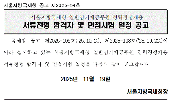 서울지방국세청 공고 제2025-54호 입니다. 국세청 공고 제2025-103호, 제2025-108호에 따라 실시하고 있는 서울지방국세청 일반임기제공무원 경력경쟁채용 서류전형 합격자 및 면접시험 일정을 다음과 같이 공고합니다. 2025년 11월 19일 서울지방국세청장