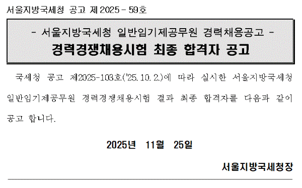 서울지방국세청 공고 제2025-59호 입니다. 국세청 공고 제2025-103호에 따라 실시한 서울지방국세청 일반임기제공무원 경력경쟁채용시험 결과 최종 합격자를 다음과 같이 공고 합니다. 2025년 11월 25일 서울지방국세청장