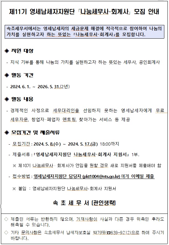 제11기 영세납세지원단 나눔세무사・회계사 모집 안내