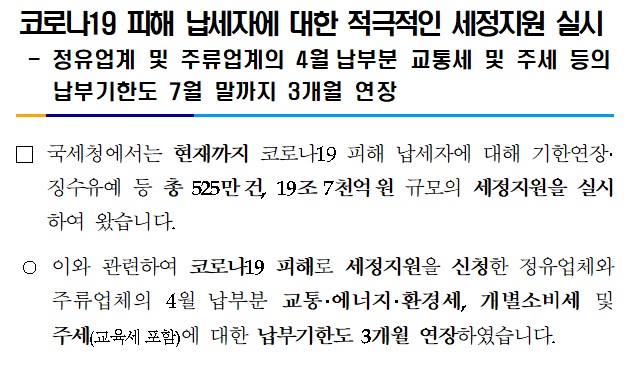 코로나19 피해 납세자에 대한 적극적인 세정지원 실시