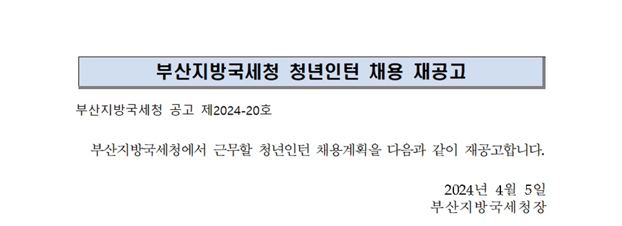 부산지방국세청 청년인턴 채용 서류전형 합격자 공고